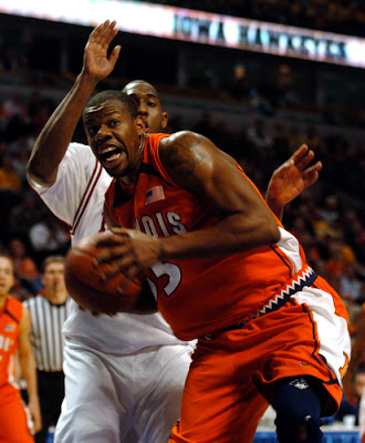 Biz Markie shot about 80% from the charity stripe v. my Boilers last Saturday, but went 1 for 6 in the final minute and first overtime...if he would have hit half of his free throws this evening (he's a 56% free throw shooter versus everybody but Purdue), Illinois probably would have won. But it's not all on his shoulders. Illinois' motion offense looked as if the Illini had never practiced it...and if McCamey wasn't draining one of his 724 three pointers on the night, they were just kind of standing around waiting for him to do so again.